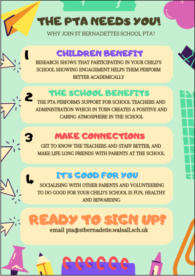 You can email them directly on pta@stbernadette.walsall.sch.uk, speak to the Main Office or speak to any of our PTA volunteers face-to-face.