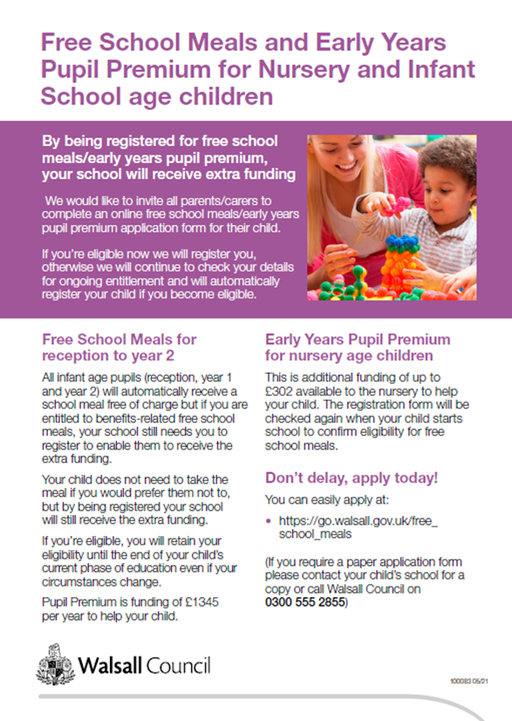 You should register for Free School Meals, even if your child is in Reception to Year 2 and receives a ‘Universal Free School Meal’. If your application for Free School Meals is successful, St. Bernadette’s Catholic Primary School will also receive extra funding from the Government to use in support of teaching and learning (Pupil Premium).